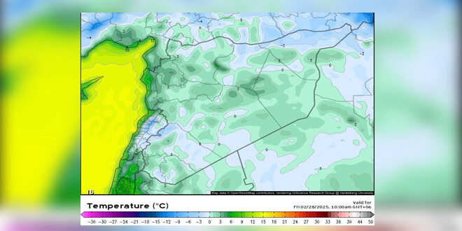 توالي درجات الحرارة ارتفاعها النسبي مع استمرار الصقيع في بعض المناطق، ليبدأ تأثير منخفض جوي ضعيف يوم السبت المقبل، يستمر حتى ساعات المساء، مترافقا بهطولات مطرية خفيفة، تشتد لتصبح متوسطة الغزارة على المناطق الساحلية، وتترافق أحياناً بالعواصف الرعدية.