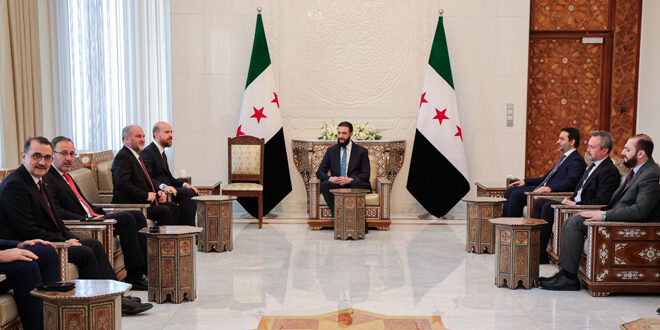 استقبل رئيس الجمهورية العربية السورية السيد أحمد الشرع ووزير الخارجية السيد أسعد الشيباني نجل رئيس الجمهورية التركية رئيس وقف نشر العلوم السيد بلال أردوغان والوفد المرافق له في قصر الشعب بدمشق.