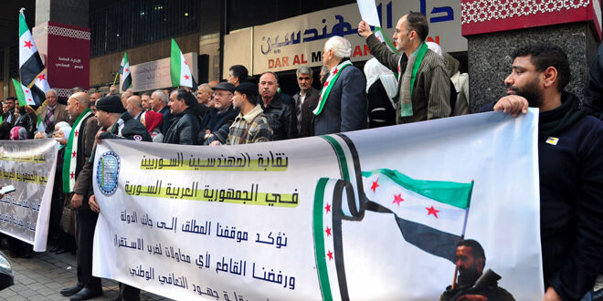 نظمت نقابة المهندسين اليوم وقفة تضامنية، دعماً للجهود السياسية والعسكرية التي تتخذها الحكومة السورية لمواجهة التحديات التي تهدد استقرار البلاد، وعلى رأسها مكافحة القوى الإرهابية، والتصدي للمؤامرات الرامية إلى زعزعة السلم الأهلي.