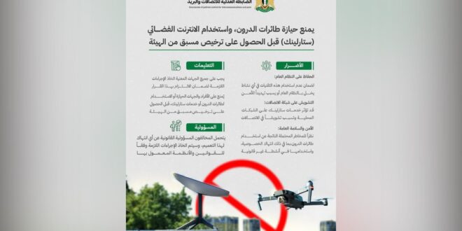أكدت الهيئة الناظمة للاتصالات والبريد منع حيازة واستخدام طائرات الدرون، والإنترنت الفضائي “ستارلينك” قبل الحصول على إذن مُسبق منها.