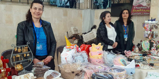يقدم عدد من أصحاب المشروعات متناهية الصغر أعمالاً ومنتجات يدوية متنوعة ضمن معرض تقيمه جمعية الجوهرة الخيرية في السويداء، بمناسبة يوم المرأة العالمي، بمشاركة نحو ٤٠ عارضاً غالبيتهم من النساء.