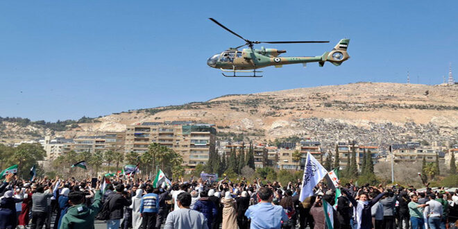 2025-03-15دمشق-ساناإلقاء الورود فرحاً بالنصر على حشود المتظاهرين بساحة الأمويين… سلاح الجو في الجيش العربي السوري يشارك باحتفالات الذكرى الـ 14 للثورة السورية المباركة. الجيش العربي السوري 2025-03-15Zeina