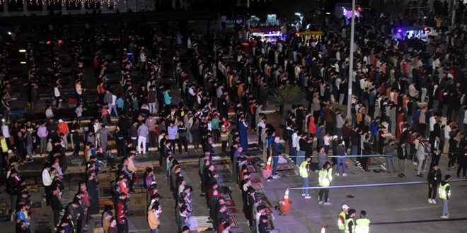 إقامة صلاة التراويح في ساحة العاصي بحماة قبيل بدء الاحتفالات بالذكرى الـ 14 للثورة السورية