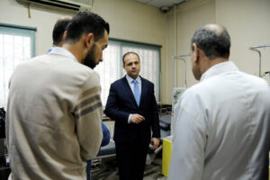 رافق القائم بأعمال الوزارة في جولته، معاونه الدكتور حسين الخطيب، ومدير صحة دمشق الدكتور أكرم معتوق، ومدير بنوك الدم في وزارة الصحة مصطفى الجازي، ومدير مديرية الرقابة الدوائية والشؤون الصيدلانية الدكتور إبراهيم الحساني، ومعاون مدير الإمداد يامن معلم.