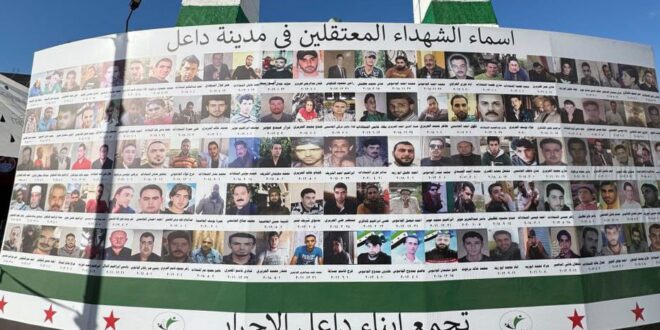 وأوضح عضو تجمع أبناء داعل الأحرار، مسؤول ملف المعتقلين والأيتام كمال العاسمي في تصريح لمراسل سانا: “إن اللوحة الجدارية تضم نحو ٧٥٠ شهيداً و١٢٥ مفقوداً ومغيباً، تم توثيقهم بالاسم والصورة وتاريخ الاستشهاد أو الاعتقال، موضحاً أن هذا العمل من شأنه تذكير الأجيال بقيمة الشهادة والشهداء وتضحياتهم، على مدى 14 عاما حتى انتصرت الثورة، ونال أبناء سوريا حريتهم بسقوط النظام المجرم.