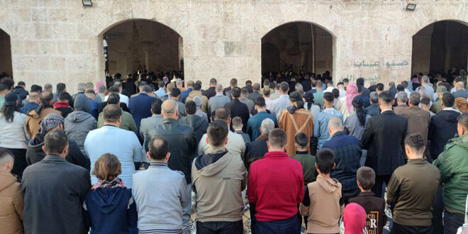 إقامة أول صلاة عيد الفطر في الجامع الكبير في مدينة معرة النعمان بعد تحرير سوريا