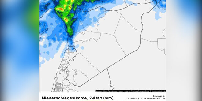 ووفق تحليل الخرائط الجوية الصادر عن مكتب الإنذار المبكر للعوامل الجوية في الدفاع المدني السوري؛ يكون طقس الليلة غائماً جزئياً يتحوّل إلى غائم ماطر على فترات في الساحل، مع فرص لزخات سريعة على غرب إدلب وحلب، وتكون فرص الصقيع والضباب معدومة على كل المناطق السورية.