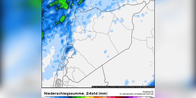 ووفق تحليل الخرائط الجوية الصادر عن مكتب الإنذار المبكر للعوامل الجوية في الدفاع المدني السوري، يكون طقس الغد صحواً مشمساً مستقراً مع انتشار طفيف لبعض السحب المتفرقة خلال ساعات الصباح، واعتباراً من ساعات ظهر الغد تتحضر الفرص لزخات أمطار رعدية تطال أجزاء من الساحل وإدلب وحلب وغرب حماة وحمص، إضافة إلى زخات رعدية تطال أجزاء من الجزيرة خلال ساعات المساء، و تكون الأجواء في بقية المناطق السورية مشمسة مع انتشار لبعض السحب المتفرقة.