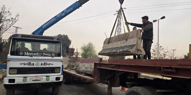 إزالة الحواجز الإسمنتية والأسلاك الشائكة التي وضعها النظام البائد أمام “فرع فلسطين” بدمشق وتسهيل حركة الآليات والمركبات أمام السائقين