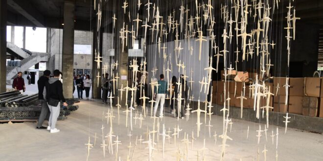 في بناء قيد الإنشاء يطل على نهر بردى بمدينة دمشق، توقف العمل فيه قبل سنوات وترك عارياً، قرر فنانون شباب أن يسكبوا إبداعهم فيه، ليجعلوا من الإسمنت البارد معرضاً ينبض بالحياة والأمل حمل اسم “طريق.”