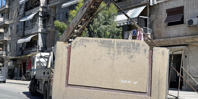 مجلس مدينة حلب بالتعاون مع الدفاع المدني يبدأ بإزالة الحواجز الإسمنتية من أمام مبنى فرع الأمن السياسي وحي السليمانية