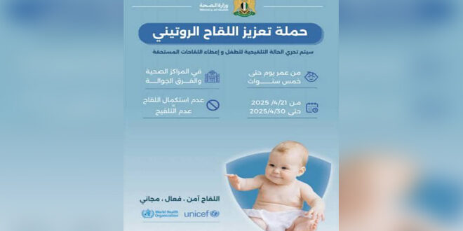 تطلق وزارة الصحة غداً حملة تعزيز اللقاح الوطنية الشاملة لمتابعة الأطفال المتسربين من عمر يوم وحتى 5 سنوات، وتستمر حتى الـ 30 من الشهر الجاري في مختلف المحافظات.