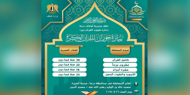 أعلنت مديرية أوقاف درعا عن جائزة حوران للقرآن الكريم، والتي تستهدف فئات عمرية مختلفة.