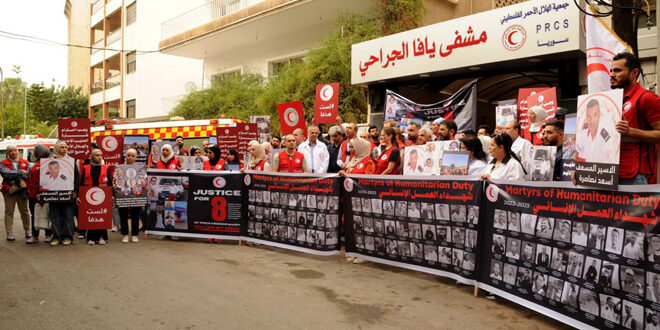 شارك الهلال الأحمر العربي السوري اليوم في الوقفة التضامنية التي نظمها الهلال الأحمر الفلسطيني أمام مشفى يافا بدمشق، تنديداً بالاعتداءات الإسرائيلية التي تتعرض لها الطواقم الطبية في قطاع غزة.