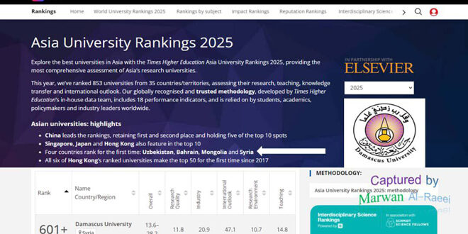 مدير مكتب التصنيف في جامعة دمشق الدكتور مروان الراعي، أوضح في تصريح لـ سانا اليوم أن تصنيف دول آسيا يضم 853 من أفضل جامعات آسيا ومراكزها البحثية، وذلك من أصل أكثر12 ألف جامعة ومركز بحثي متواجد في قارة آسيا جمعاء، وقد جاءت جامعة دمشق في المجال +601 من هذا التصنيف.