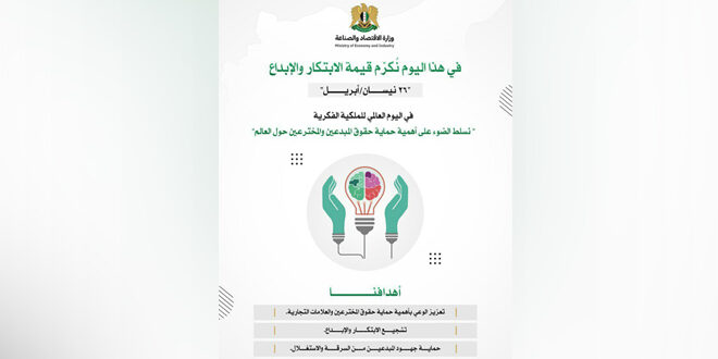 وبمناسبة اليوم العالمي للملكية الفكرية الذي يصادف في ال26 من نيسان، جددت الوزارة في قناتها على تلغرام السعي لتعزيز الوعي بأهمية حماية حقوق المخترعين والعلامات التجارية، وتشجيع الابتكار والإبداع، وحماية جهود المبدعين من السرقة والاستغلال، ودعم الاقتصاد الإبداعي والتنمية المستدامة.