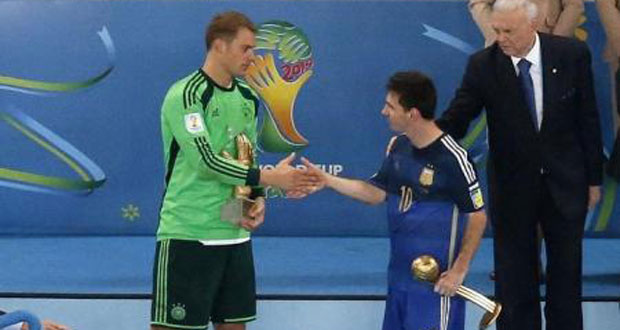 ونال ميسي الجائزة عقب خسارة الأرجنتين 1-صفر أمام المانيا في النهائي يوم الأحد .