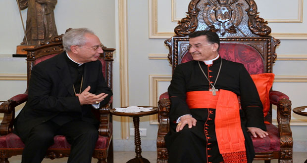 بحث البطريرك الماروني الكاردينال مار بشارة بطرس الراعي اليوم مع عميد محكمة التوقيع الرسولي العليا الكاردينال دومينيك مومبرتي موفد البابا فرنسيس إلى لبنان الأوضاع العامة في لبنان والمنطقة.