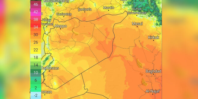 تميل درجات الحرارة للارتفاع خلال الأيام القادمة، وتصبح أعلى من معدلاتها بنحو 7 إلى 10 درجات مئوية مع نهاية الأسبوع الحالي ومطلع القادم ، وتشهد الأجواء استقراراً في عموم المناطق السورية غداً الثلاثاء.