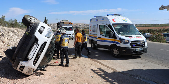 أصيب رجل وامرأتان وثلاثة أطفال بجروح بليغة، جراء انقلاب سيارة كانوا يستقلونها، على الطريق الدولي حلب دمشق، بالقرب من مدينة خان شيخون في ريف إدلب اليوم.