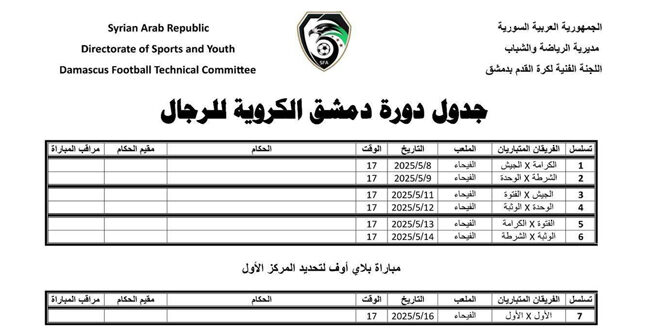 تحضيراً للدوري الممتاز بكرة القدم، الذي سينطلق في الـ 21 من الشهر الحالي، تقيم مديرية الرياضة والشباب بدمشق، وبالتعاون مع اللجنة الفنية لكرة القدم بدمشق دورة كروية ودية للرجال، وذلك ابتداءً من يوم الغد حتى الـ 16 من أيار الحالي.