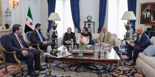 2025-05-07باريس-ساناالتقى السيد الرئيس أحمد الشرع بالسيد باسكال جولنيش رئيس منظمة عمل الشرق في باريس، وذلك في مستهل زيارته إلى الجمهورية الفرنسية.حضر اللقاء كل من السيد أسعد الشيباني وزير الخارجية والمغتربين، والسيد رائد الصالح وزير الطوارئ والكوارث. السيد الرئيس أحمد الشرع باسكال جولنيش رئيس منظمة عمل الشرق 2025-05-07malek
