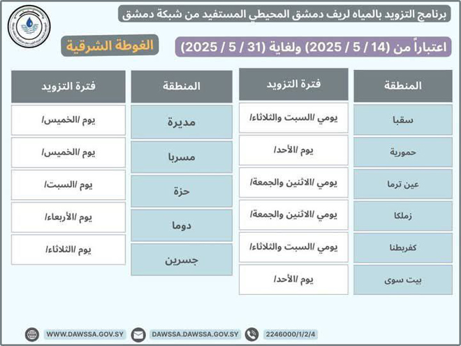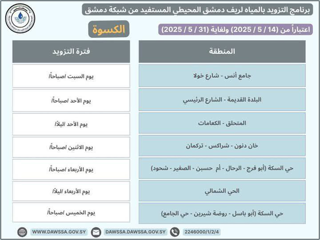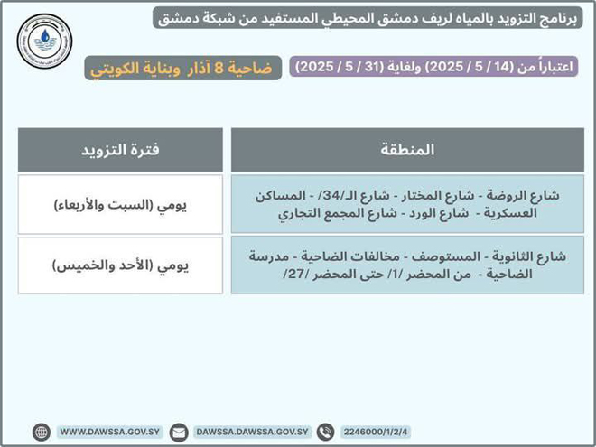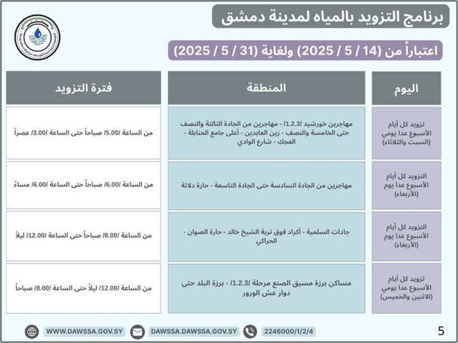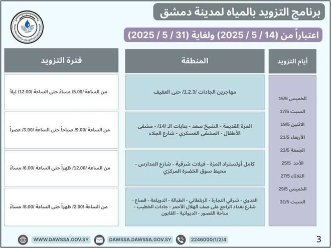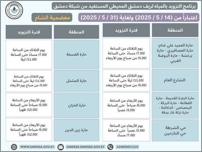 أعلنت المؤسسة العامة لمياه دمشق وريفها البرنامج الجديد لتزويد مدينة دمشق وريفها بالمياه، اعتباراً من الرابع عشر من شهر أيار الجاري وحتى نهايته.