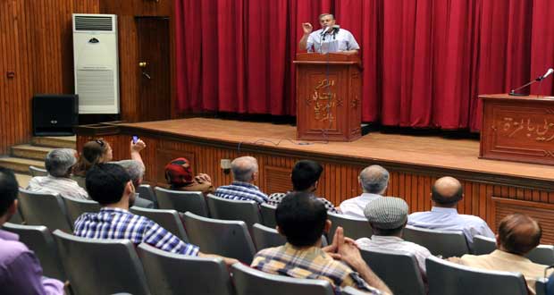 وألقى الشاعر الخطيب قصيدة بعنوان “بوح ليس إلا” بين فيه مدى العلاقة الإنسانية والانتمائية التي تربطه بمدينة تدمر موضحا الصفات الجمالية والتاريخية التي تتفرد بها هذه المدينة معبرا عن ذلك من خلال موهبته في تركيب البنية الفنية للنص حيث جاء البحر الكامل متوافقا مع كل البنى والدلالات المكونة للنص فقال..