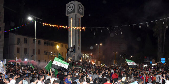 احتفالات في ساحة الساعة الجديدة بحمص بعد قرار الرئيس الأمريكي ترامب رفع العقوبات المفروضة على سوريا