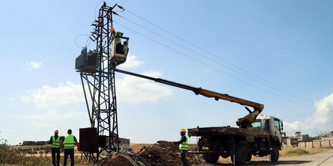 ورشات الكهرباء في تلدو بريف حمص تواصل إصلاح أعطال التيار الكهربائي وتبديل الشبكات القديمة