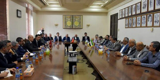بحث رئيس جامعة دمشق الدكتور محمد أسامة الجبّان مع رئيس مجلس التعليم العالي التركي الدكتور ٱرول أوزفار والوفد الأكاديمي المرافق اليوم بحضور القائم بأعمال السفارة التركية بدمشق برهان كورأوغلو، التعاون العلمي والثقافي بين جامعة دمشق والجامعات التركية.