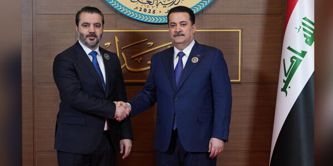 استقبل رئيس مجلس الوزراء العراقي محمد شياع السوداني، وزير الخارجية والمغتربين السيد أسعد الشيباني، رئيس وفد الجمهورية العربية السورية المشارك في أعمال القمّة العربية في مقر انعقاد القمة في بغداد.