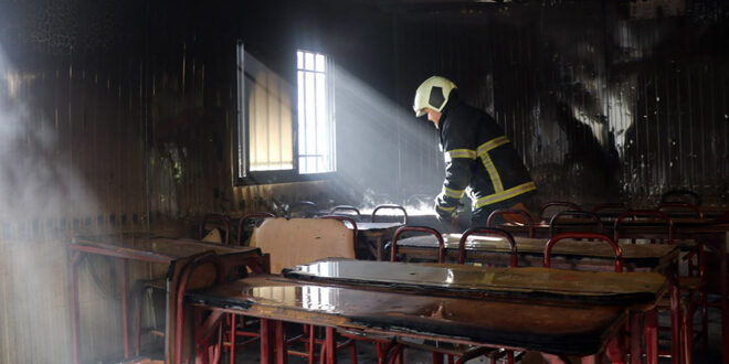 أخمدت فرق الإطفاء في الدفاع المدني السوري اليوم حريقاً مجهول السبب داخل غرف مسبقة الصنع (شعب صفية) عدد 2 في مدرسة عصام النادري في حي طريق الباب بمدينة حلب.
