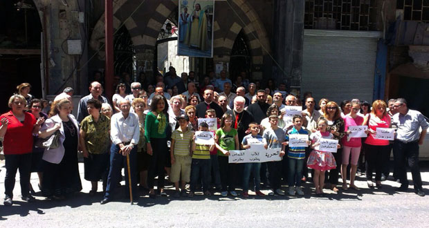 ورفع المشاركون لافتات تضامنية كتب عليها “لا للعنف .. لا للإرهاب ..كلنا سوريون .. نحن نعشق الحياة ..” مؤكدين التمسك بالوحدة الوطنية ورفض الأعمال الإجرامية التي تقوم بها التنظيمات الإرهابية المسلحة بحق الشعب السوري من تخريب وخطف واعتداء مبينين أن اختطاف رجال الدين يهدف إلى النيل من كلمة الحق والصدق وتغييب كل من يعمل على نشر الخير والفضيلة في المجتمع.