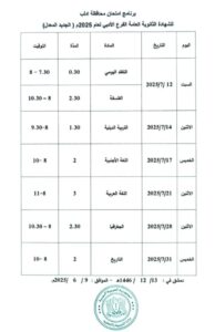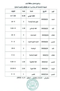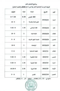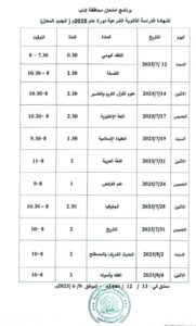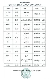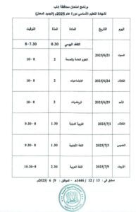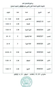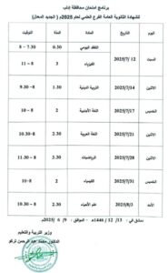 كما تبدأ امتحانات شهادتي التعليم الأساسي والإعدادية الشرعية يوم السبت الـ 21 من شهر حزيران الجاري، وتستمر حتى يوم الأربعاء الـ 9 من شهر تموز القادم للتعليم الأساسي، وحتى يوم الخميس الـ 10 منه للإعدادية الشرعية.