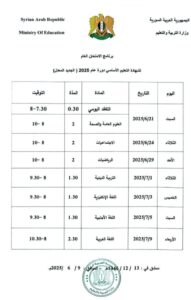 أصدرت وزارة التربية والتعليم اليوم البرامج الامتحانية لشهادتي التعليم الأساسي والثانوية العامة بفروعها “الأدبي والعلمي والشرعي” بعد التعديل، والذي سيشمل كامل طلاب الجمهورية العربية السورية.