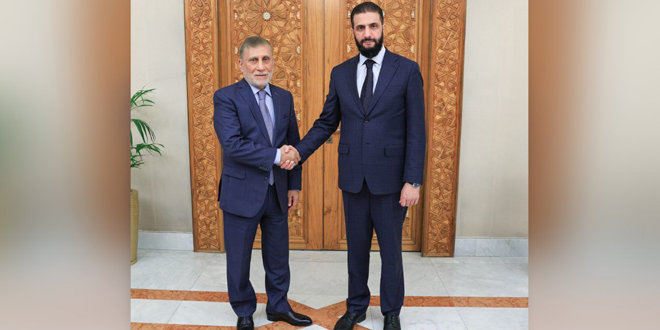2025-06-09دمشق-سانااستقبل رئيس الجمهورية العربية السورية السيد أحمد الشرع في قصر الشعب بدمشق المبعوث الخاص لرئيس الوزراء العراقي إلى سوريا السيد عزت الشابندر. الرئيس الشرع 2025-06-09Zeina
