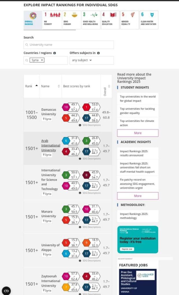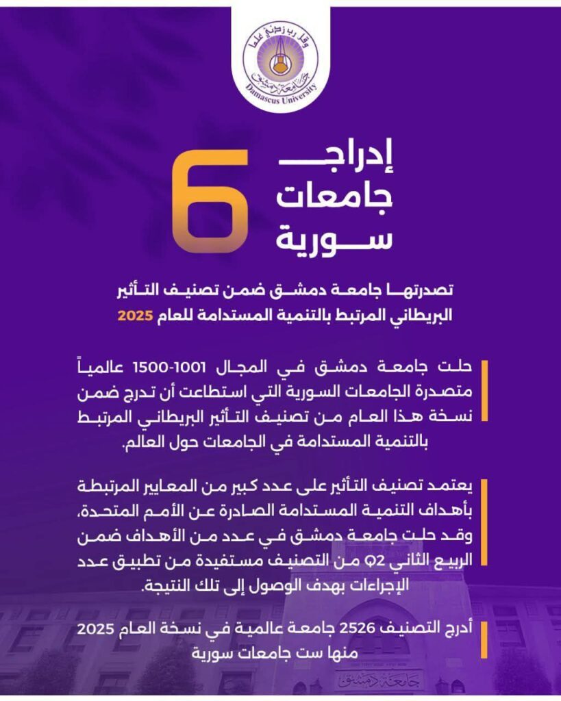 أدرج تصنيف “التأثير” التابع لصحيفة “التايمز” البريطانية، ست جامعات سورية في نسخته لعام 2025، وذلك استناداً على مساهمتها في دعم أهداف التنمية المستدامة التي أوصت بها منظمة الأمم المتحدة.