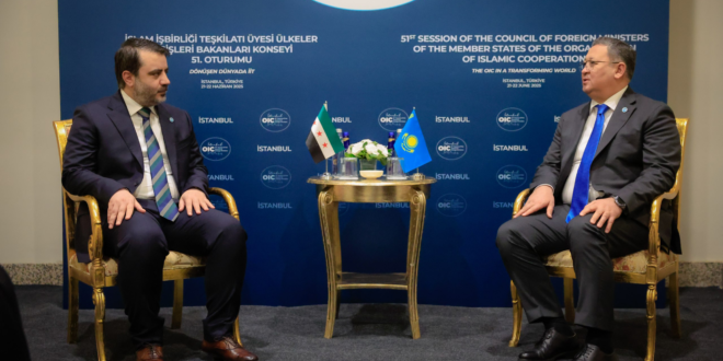 التقى وزير الخارجية والمغتربين السيد أسعد الشيباني وزير خارجية كازاخستان السيد مراد نورتليو، على هامش أعمال الدورة الحادية والخمسين لمجلس وزراء خارجية الدول الأعضاء في منظمة التعاون الإسلامي المنعقدة في إسطنبول.