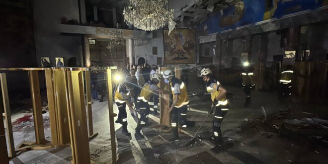 مشاهد لفرق الدفاع المدني أثناء عملها على إزالة آثار الدمار في كنيسة مار إلياس بدمشق عقب الهجوم الإرهابي الذي استهدفها