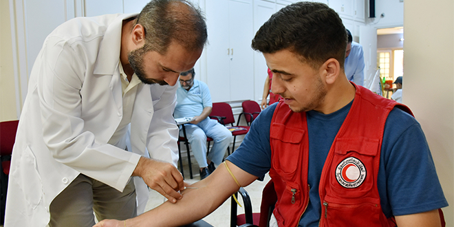 نظمت نقابة الأطباء في حمص بالتعاون مع مديرية الصحة وبنك الدم وفرع منظمة الهلال الأحمر بالمحافظة اليوم حملة تطوعية للتبرع بالدم، وذلك ضمن مركز الإسعاف في الهلال الأحمر بحي الغوطة.