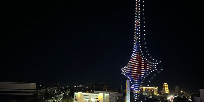 مشاهد من العرض البصري لطائرات الدرون في ساحة الأمويين بدمشق، احتفالاً بإطلاق الهوية البصرية الجديدة للجمهورية العربية السورية