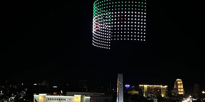 احتفالاً بإطلاق الهوية البصرية الجديدة للجمهورية العربية السورية، عرض بصري لطائرات الدرون في ساحة الأمويين بدمشق.