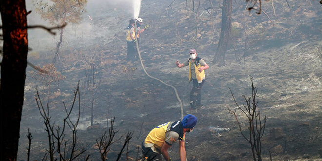 لقطات لعناصر وزارة الدفاع وفرق الدفاع المدني السوري أثناء عملها على إخماد الحرائق في جبال وغابات ريف اللاذقية الشمالي