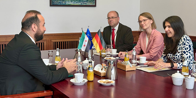 التقى وزير الإعلام الدكتور حمزة المصطفى في العاصمة الألمانية برلين وزيرة الدولة في وزارة الخارجية الألمانية سراب غولر، وذلك ضمن زيارته الرسمية إلى ألمانيا، في خطوة وصفتها الوزيرة الألمانية بـ “التاريخية” باعتباره أول وزير إعلام سوري يزور وزارة الخارجية الألمانية بعد سقوط النظام.