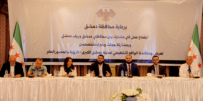 عُقد اليوم اجتماع عمل فني مشترك بين محافظتي دمشق وريفها، لعرض ومناقشة الواقع التخطيطي لمدينة دمشق الكبرى، “الرؤية والمصوَّر العام”، وذلك بحضور محافظي دمشق ماهر مروان إدلبي وريف دمشق عامر الشيخ، وبمشاركة خبراء ومتخصصين من الجهات العامة.