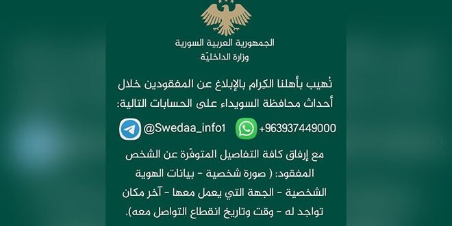 2025-07-23دمشق-ساناخصصت وزارة الداخلية حساباً على تلغرام وواتس آب للإبلاغ عن المفقودين خلال الأحداث التي وقعت في محافظة السويداء. وزارة الداخلية 2025-07-23Zeina