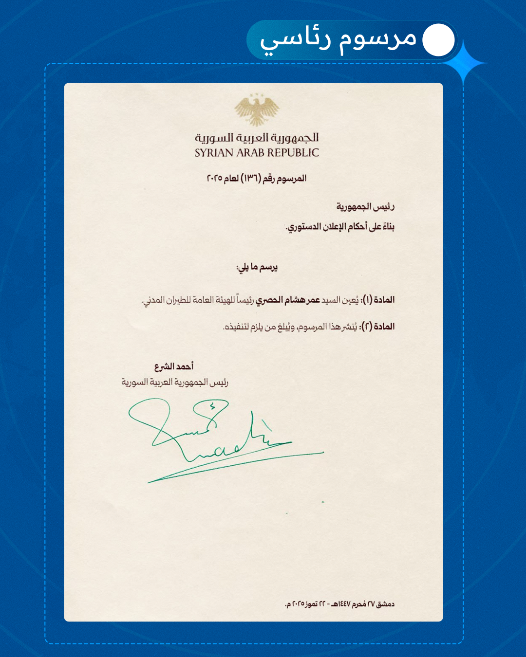 أصدر السيد الرئيس أحمد الشرع المرسوم رقم 136 لعام 2025 القاضي بتعيين السيد عمر هشام الحصري رئيساً للهيئة العامة للطيران المدني.