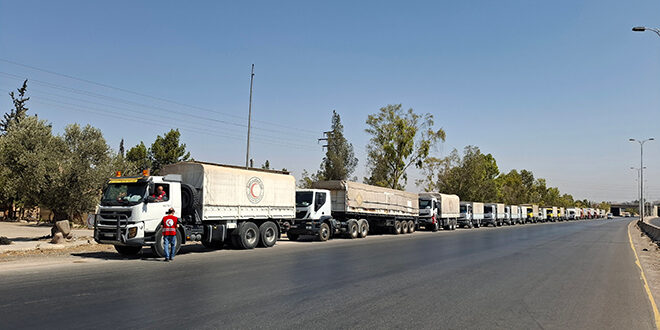 قافلة مساعدات إنسانية وغذائية للهلال الأحمر العربي السوري متوجهة إلى مدينة السويداء