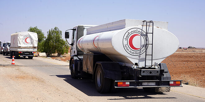 وتضم القافلة صهاريج تحمل 45 ألف ليتر من المحروقات، و 4 سيارات مواد طبية وإغاثية لأهالي السويداء.